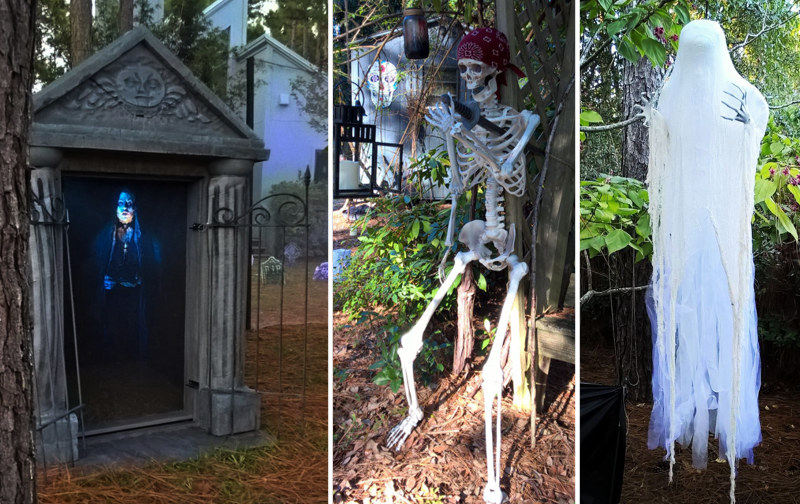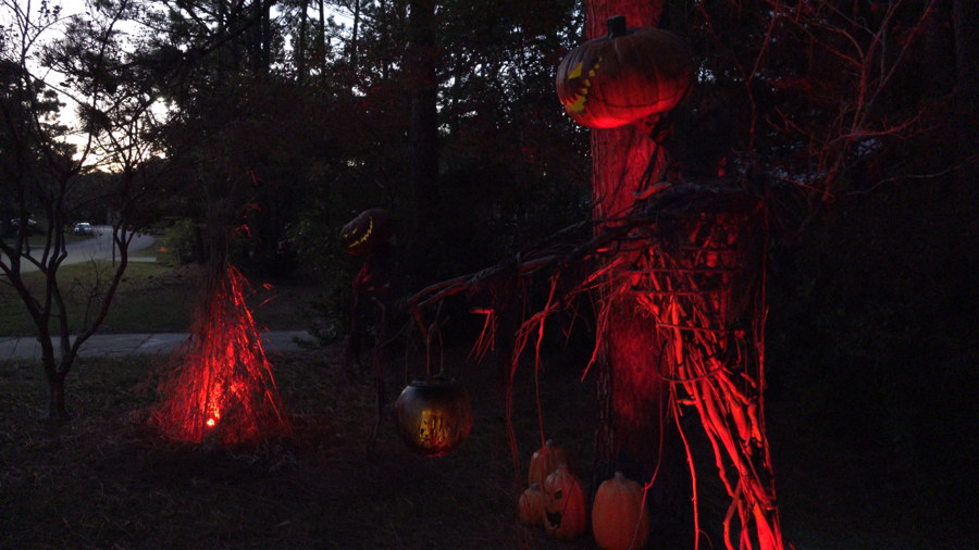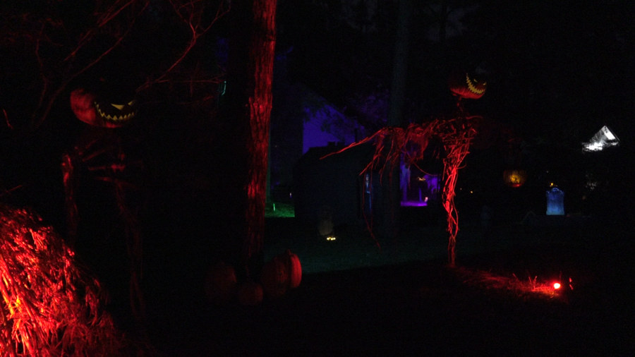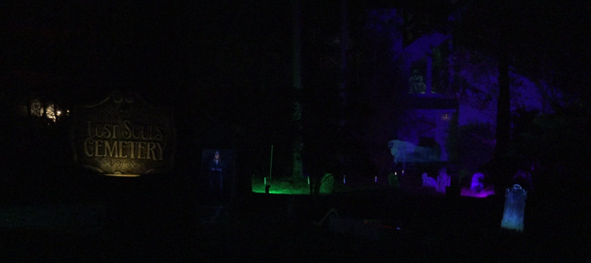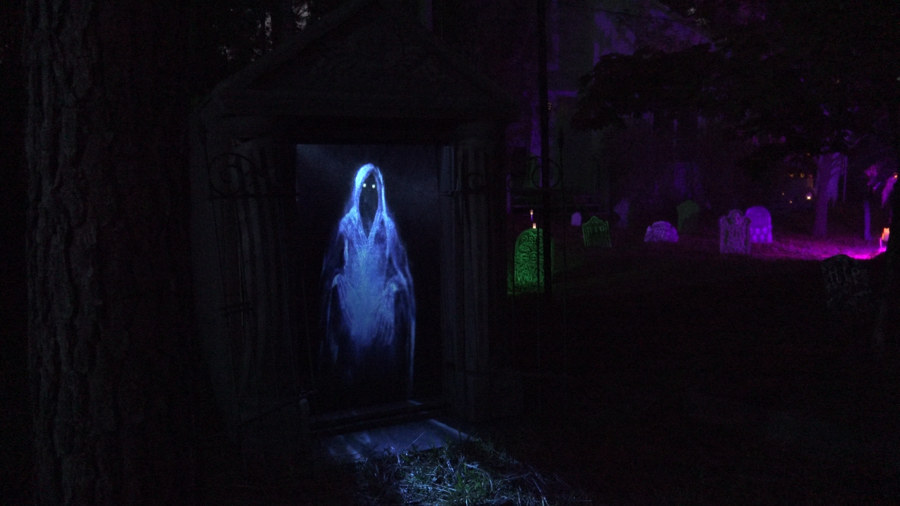 It grows. We added a mausoleum - also featuring a projection effect, a few more tombstones, a tombstone that we projected upon, a coffin (built to conceal the tombstone projector), another large scarecrow, and a window projection in the high windows overlooking the yard. Details about some of the features can be found on the Older Projects page.